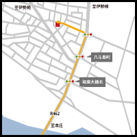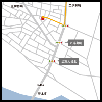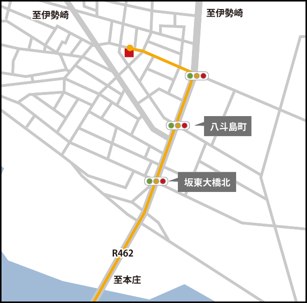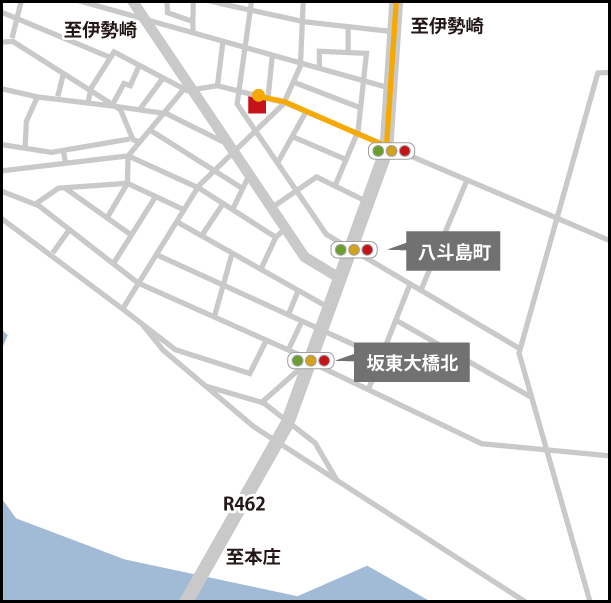 国道462号線を群馬方面に直進し、 坂東大橋を渡り3つ目の信号を左折、 約200m先の左側に当店がございます。